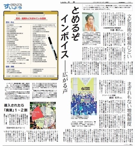 「インボイス」ってご存じですか。適格請求書とよばれ、今年10月から導入が狙われている消費税の制度です。いま、声優、アニメ、演劇など幅広い分野の団体・個人が反対・中止・延期の声をあげています。