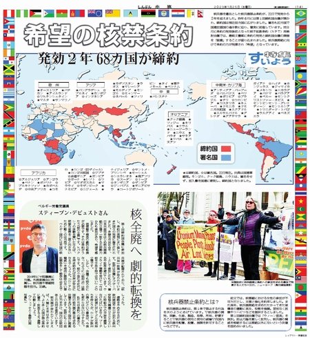 核兵器を違法とした核兵器禁止条約が、22日で発効から2年を迎えました。昨年6月には第1回締約国会議が開かれ、締約国は現在68カ国に広がりました。署名も92カ国で国連加盟国の過半数に迫り、着実に前進しています。同8月に条約の発効後初となった核不拡散条約(NPT)再検討会議では、最終文書案に条約の発効と締約国会議の開催を「認識」することが盛り込まれました。核兵器廃絶に向けて条約の力が発揮され「希望」となっています。