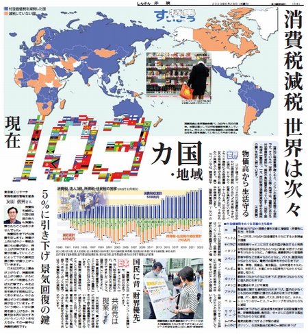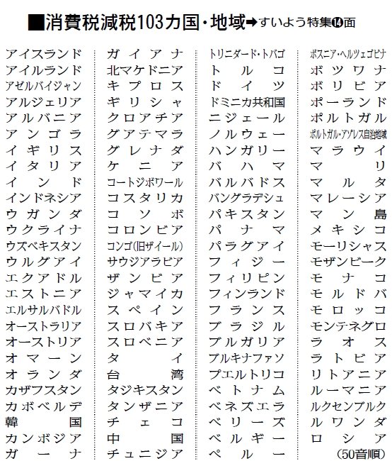 世界的に物価高騰が続くもと、インフレの影響は各国でも深刻です。そういう中、世界103の国・地域では、消費税にあたる付加価値税を減税し、国民の負担軽減を図っています(地図=国・地域名一覧)。一方、岸田政権は消費税減税を求める国民の願いを拒否し続けています。(大串昌義)
