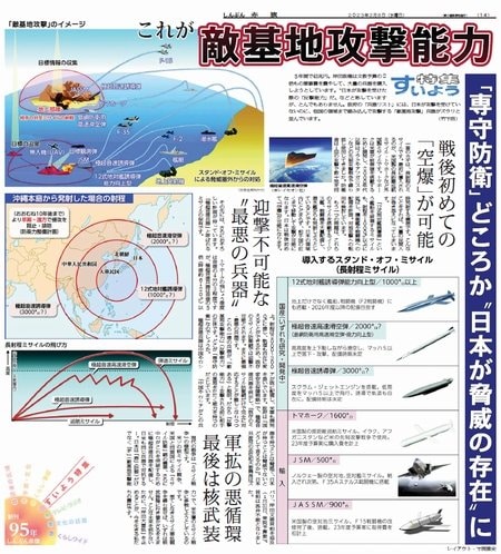 5年間で43兆円。岸田政権は文教予算の2倍もの軍事費を費やして、大量の兵器を購入しようとしています。"日本が攻撃を受けた際の「反撃能力」だ"などと称していますが、とんでもありません。政府の「兵器リスト」には、日本が攻撃を受けていないのに、他国の領域まで踏み込んで攻撃する「敵基地攻撃」兵器がズラリと並んでいます。(竹下岳)