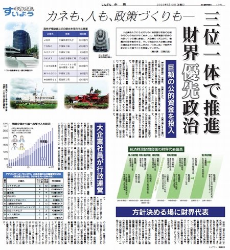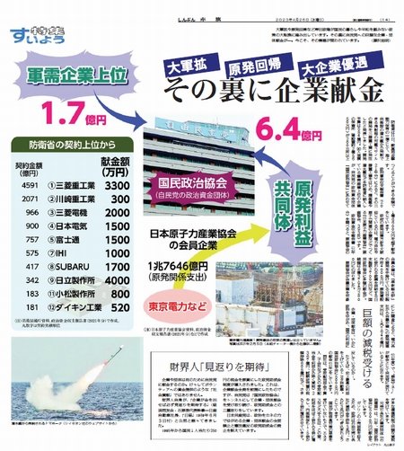 大軍拡や原発回帰など岸田政権が国民の暮らしや平和を顧みない政策の大転換に踏み出しています。その裏に自民党への巨額な企業・団体献金が―。今こそ、その害悪が問われています。(藤沢忠明)