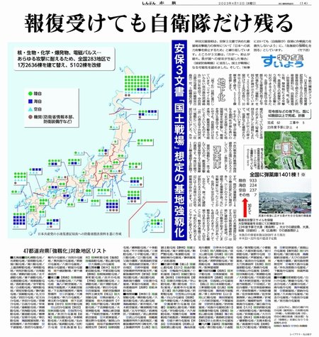 岸田文雄首相は、安保3文書で決めた敵基地攻撃能力の保有について「日本への武力攻撃を抑止するため」と繰り返しています。ところが3文書は、「万が一、抑止が破れ、我(わ)が国への侵攻が生起した場合」(国家防衛戦略)に言及し、国土が戦場になる可能性を認めました。そして、「有事においても(自衛隊が)容易に作戦能力を喪失しないよう」に、「各施設の強靱(きょうじん)化を図る」としています。(竹下岳)