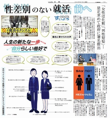 「女性が化粧をしないのは失礼」「男性の長髪は不潔」―。「女性らしさ」や「男性らしさ」を押し付ける「セクシズム」が、就職活動(就活)指導の場に根深くあります。人生の新たな一歩を踏み出そうとするときに、性差別的なマナーや服装を強いられ、その道をふさがれてしまう人も。そうした現状を変えようと、是正を求める署名活動が行われています。