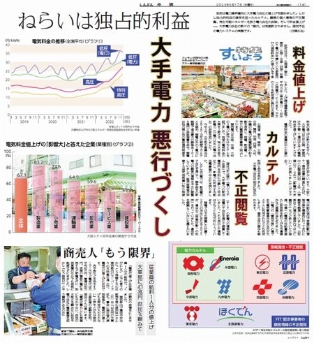 政府は電力業界優先に大手電力会社の値上げを認めました。しかし独占的利益の確保を狙ったカルテル、顧客の個人情報の不正閲覧、再生可能エネルギーを扱う電力会社の排除、そして料金値上げ―。大手電力会社の数々の"悪行"は到底許されません。国民不在の電力システムの実態です。(日隈広志)
