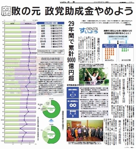 大軍拡・大増税を国民に押し付ける自民・公明とその補完勢力が、国民の税金を山分けする政党助成金に染まっています。助成金導入から今年で29年。どんな問題が―。(高柳幸雄)