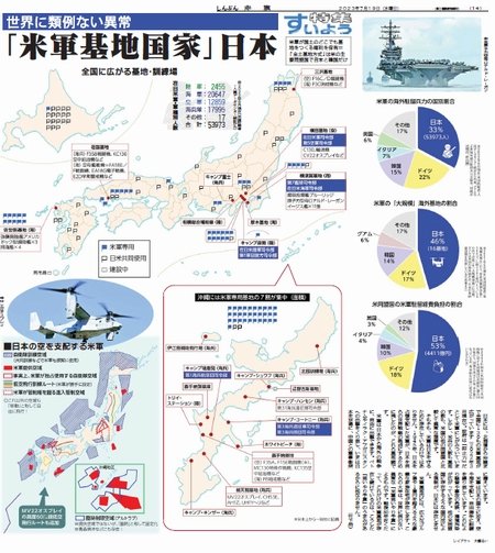 「憲法上許されない」とした歴代政府の解釈を覆し、安倍自公政権が集団的自衛権の行使容認を閣議決定(2014年7月1日)し、10年が過ぎました。自国が武力攻撃を受けていなくても、同盟国など密接な関係にある国が攻撃を受けたとき、自国への攻撃とみなして共に反撃する集団的自衛権。海外での対中国を想定した米軍中心の演習で日米が一体となった訓練が頻繁に行われる一方で、米軍は日本から直接軍事作戦を実施するために在日米軍基地の施設整備を急速に進めています。在日米軍基地の提供が、米軍の軍事作戦行動への日本の集団的自衛権行使につながりかねない事態が進んでいます。(佐藤つよし)
