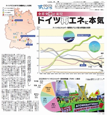 国民の粘り強い反原発運動が後押ししました。ドイツで15日、国内すべての原子力発電所の稼働が停止しました。1998年に発足した社民党・緑の党の連立政権が、脱原発を政権公約に掲げてから25年。政府と電力業界との合意や議会での法制化を通じて実現にこぎつけました。脱原発の方針は、政権交代や経済危機、ロシアによるウクライナ侵略に伴うエネルギー危機を乗り越えて貫かれました。(ベルリン=桑野白馬 写真も)