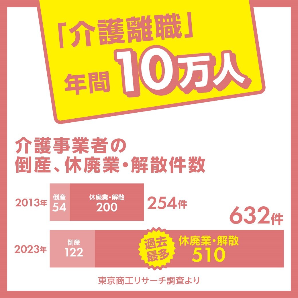 「家族が介護を受けられない」と離職する人は年10万人。介護事業者の倒産が増え、休廃業・解散は過去最多に(2023年)。原因は介護報酬の連続切り下げです。介護職の賃金は他産業より月5万円低く人員不足は限界。介護保険の国の支出を10%増やし危機打開を!#比例は日本共産党