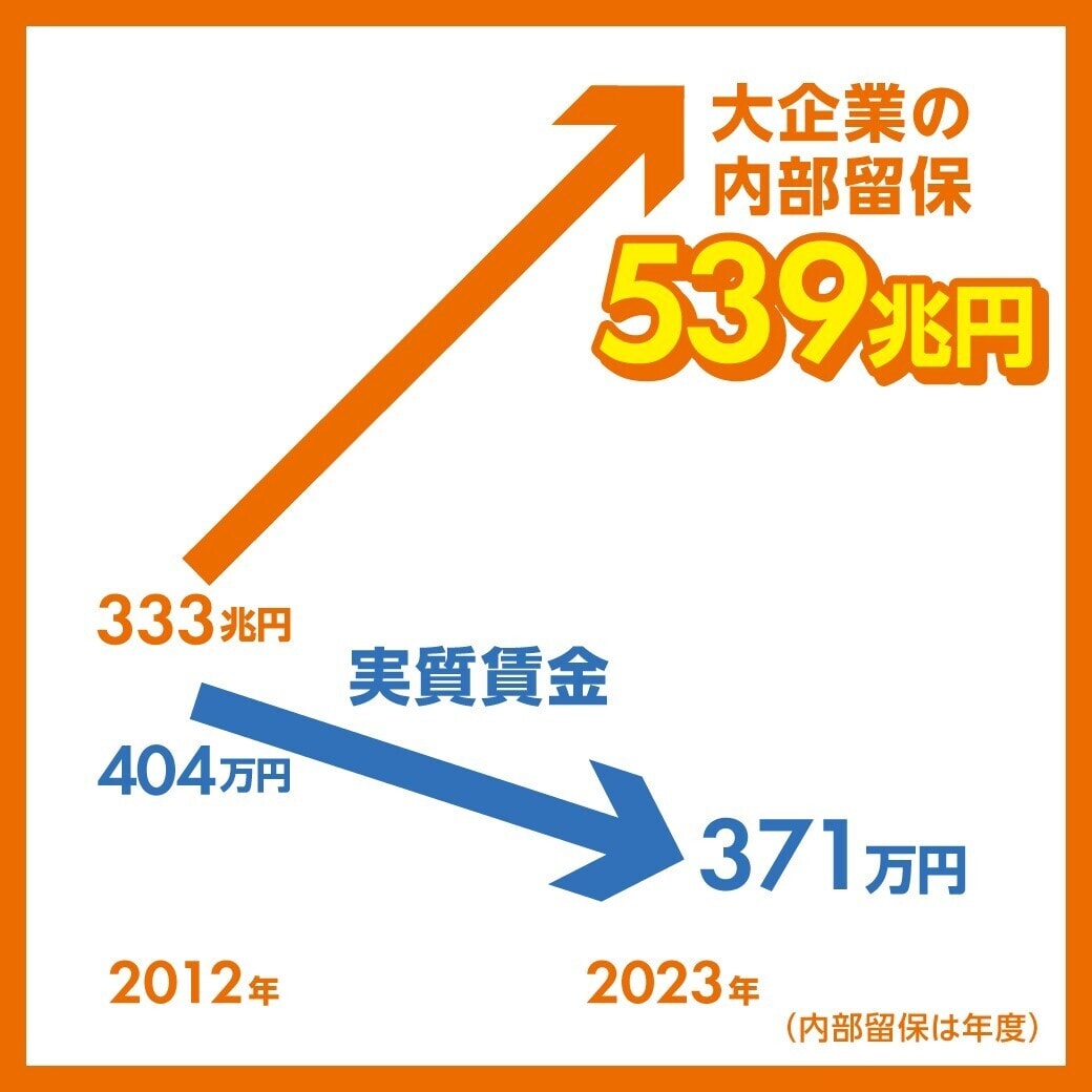 大企業の内部留保は2012年度比で200兆円増加。そこに毎年2%(5年限定)課税すれば10兆円の財源がつくれます。10兆円は内部留保累計539兆円のわずか1.9%。中小企業が強く求めている賃上げへの直接支援(社会保険料負担軽減など)を抜本的に増やせます。#比例は日本共産党