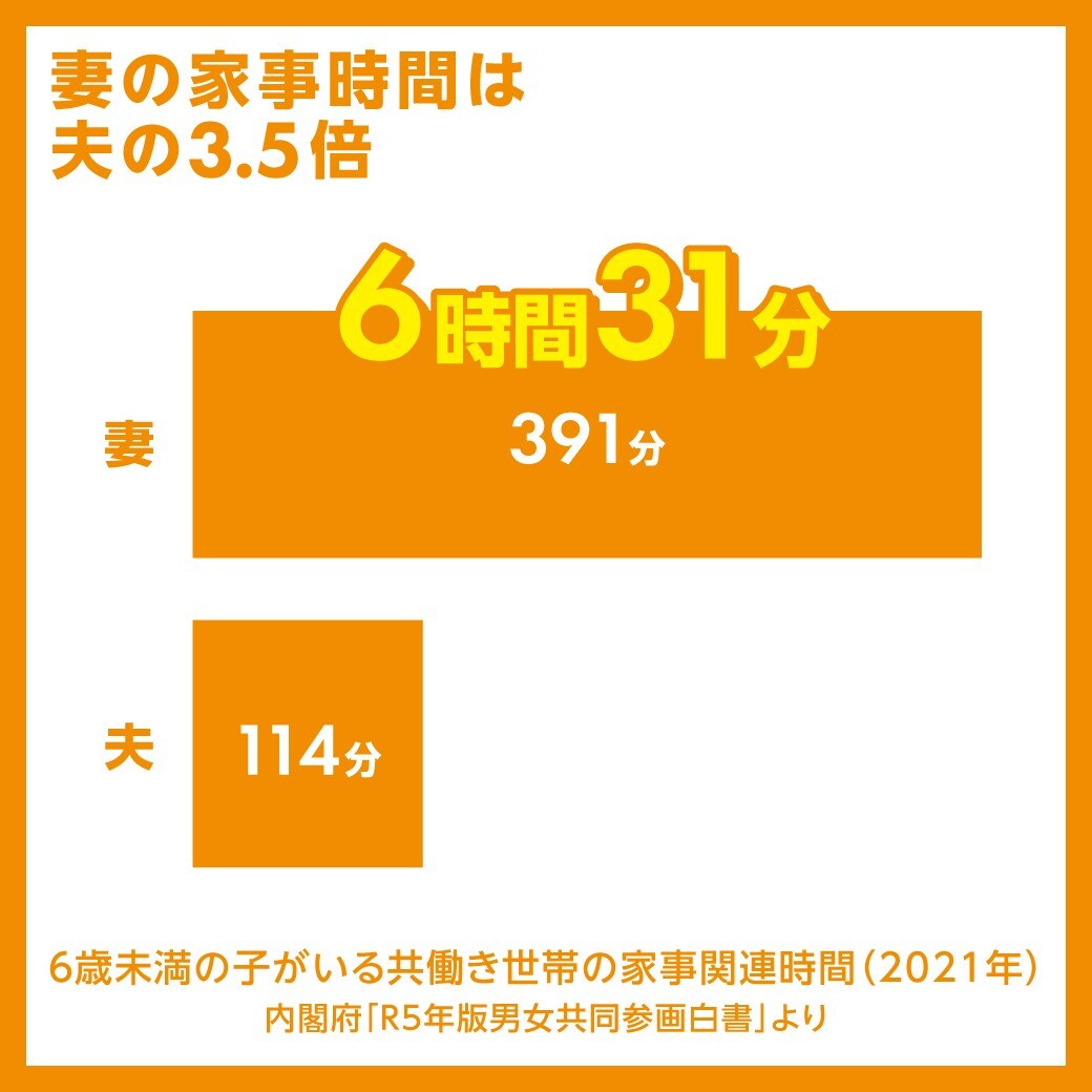 6歳未満の子どもがいる共働き世帯では、家事関連時間の8割を妻が担い、仕事時間は夫に偏っています。女性が担うケアの負担を減らすとともに、ケアの社会化を進め、労働時間を短縮しても生活できる賃金の確保が必要。誰もが仕事も家庭も大切にできる職場へ#比例は日本共産党