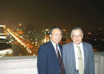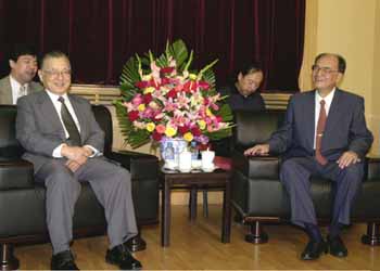 | 中国社会科学院での学術講演を前に、李慎明・同院筆頭副院長(右)とあいさつをかわす不破さん=中国社会科学院 |