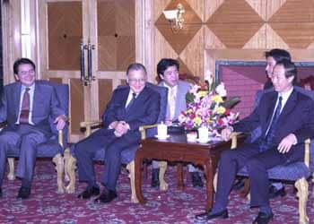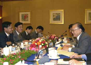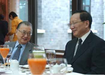 唐家セン外相(右)主催の昼食会に招かれ、昼食をともにしながら懇談する不破さん=釣魚台国賓館 |