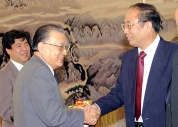 中国共産党と政府の対外宣伝の責任者である趙啓正新聞弁公室主任(右)と握手する不破さん=中国国務院新聞弁公室 |
