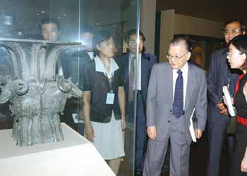 | 中国歴史博物館で展示されている貴重な文化財を見学する不破さん(中央)。人民大会堂の向かい側にある同博物館は、今年で創設90周年。40万件の文化財を所蔵しています |