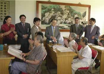 | 「北国の春」で出迎え 北京市海淀区四季青郷の老人ホームを訪れ、入所しているお年よりから「北国の春」の歌で迎えられる不破さんら |