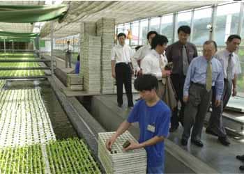 四季青郷内にある農業企業の野菜水耕栽培施設を視察する不破さん(右から2人目)。出口で揮ごうを求められ、「ハイテク農業に中国の未来の一側面を見た思いです」と記しました |