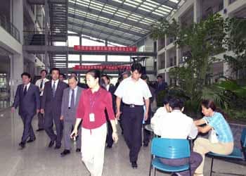 | 北京市内西北部の中関村にある中国最大のコンピューター会社・連想集団の施設を見学する不破さんら。連想集団は、1万2000人の社員の平均年齢が28歳という若い会社で、中庭のようなところで、社員が自由な雰囲気で議論する姿が見られました |