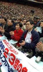 前日の夜から、朝暗いうちから、参加者を乗せて会場に到着したバスは百数十台。午前五時に家を出て飛行機できたという福岡・大牟田市の仁戸田(にえだ)孝義さん(67)は、「問答無用に医療費を上げる小泉政権のやり方は、暴力団そっくりだ。六十七歳になった。私の人生の最後の力を振り絞って、多くの人と力を合わせ、人間が大事にされる社会に半歩でも近づきたい」と語ります。