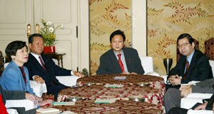 ![]() 会談にのぞむ野党4党首。右から日本共産党・志位委員長、民主党・鳩山代表、自由党・小沢党首、社民党・土井党首=27日、国会内 |