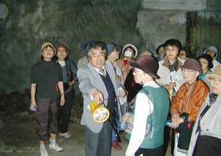「館山海軍航空基地は中国爆撃を担った侵略の中心。地下ごうは本土決戦の拠点で、天皇や大本営を松代(長野県)に移すまでの“捨て石”だった場所です。降伏が数週間遅かったら、沖縄と同じ悲劇が起こったかもしれません」と、地下ごうのなかで解説する愛沢さん。参加者からも「身近な千葉に、こんなに大きな地下ごうがあるとは…」とため息がもれます。