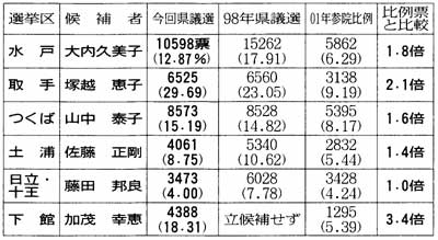 今回の県議選で、自民党は、従来の支持基盤の崩れから、現職六人が落選するなど、前回の四十七議席から三十九議席に後退。保守系無所属の当選者を加えて、やっと改選前勢力を維持する見込みです。民主党は、オール与党の一員として、自民党政治との対決軸を示せず、五議席から三議席に減少。公明党は、現状維持の三議席。水戸市で議席獲得をめざした社民党は前回票を下回り、議席を獲得できませんでした。