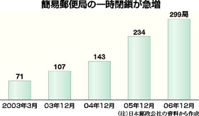 また、全国に約四千四百ある簡易郵便局についても、一時閉鎖が二〇〇三年三月末の七十一局から、〇六年十二月末には二百九十九局に急増。さらに約二百局の簡易郵便局長が委託契約を解約・保留の意向を公社に示しており、最大であわせて五百局が閉鎖される危険があります。