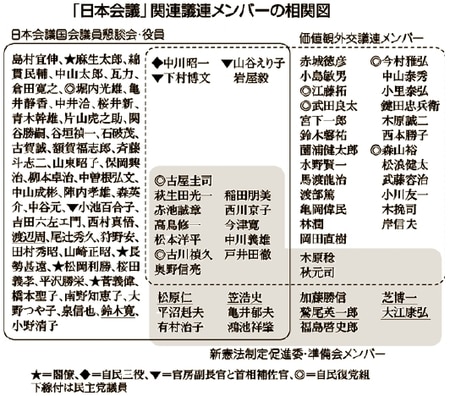 「従軍慰安婦」の問題では、日本会議ができた一九九七年に、自民党内に「日本の前途と歴史教育を考える若手議員の会」(後に「議員の会」)が結成され、教科書の記述を削除させようと政府や教科書会社に圧力をかけました。会創立時の代表が中川昭一自民党政調会長。事務局長が安倍晋三首相で、副代表に松岡利勝農水相、幹事長代理に高市早苗男女共同参画担当相が就任していました。