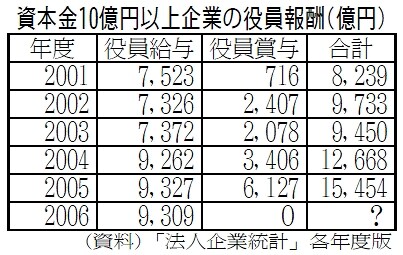 とりあえず統計で「0」となっている理由はわかりました。しかし、別表をみるとわかるように、役員給与は、〇五年度に九千三百二十七億円だったものが〇六年度には九千三百九億円に減少しています。このなかに「賞与」も含まれているとは、とても考えられません。