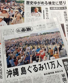 旧日本軍による沖縄戦での「集団自決」強制を削除した文部科学省の教科書検定問題で、いち早く、沖縄県民の怒りの声を連載や社会リポートで紹介、十一万人が参加して大成功した「9・29沖縄県民大会」の息吹を現地から詳しく伝えました。地元紙記者は「全国紙でキャンペーンしたのは、『赤旗』だけ」といいます。