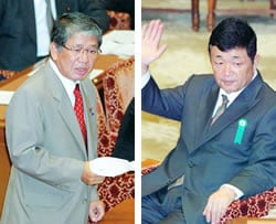 ![]() (写真)喚問する赤嶺政賢議員(左)と守屋前事務次官=29日、衆院テロ特別委 |