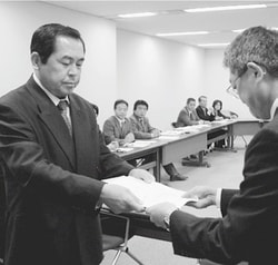 米海兵隊岩国基地(山口県岩国市)への米空母艦載機移転に反対している「住民投票を力にする会」は二十九日、防衛省を訪れて移転反対と市庁舎補助金の交付を要請しました。日本共産党の仁比聡平参院議員も同席しました。