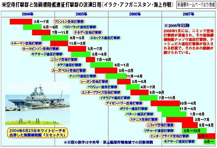 実際にエセックス遠征打撃群は、ペルシャ湾でイラク石油基地防衛などを行い、乗り組んだ海兵隊部隊は、数千人ともいわれるイラク市民を殺害したファルージャ攻撃にも参加しています。
