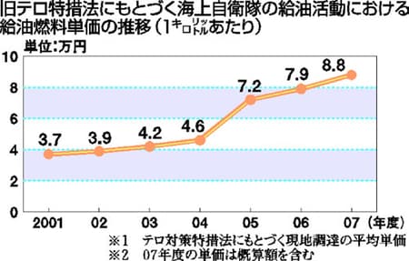 吉井氏は、政府資料をもとに、二〇〇一年から〇七年まで給油燃料単価が毎年のように上昇し、一キロリットルあたり三・七万円から八・八万円へと二・四倍も値上がりした実態を指摘(グラフ)。戦争支援には、燃料価格の上昇分も含めて、国民の税金を気前よくつぎ込み、タダで給油していたことを明らかにしました。
