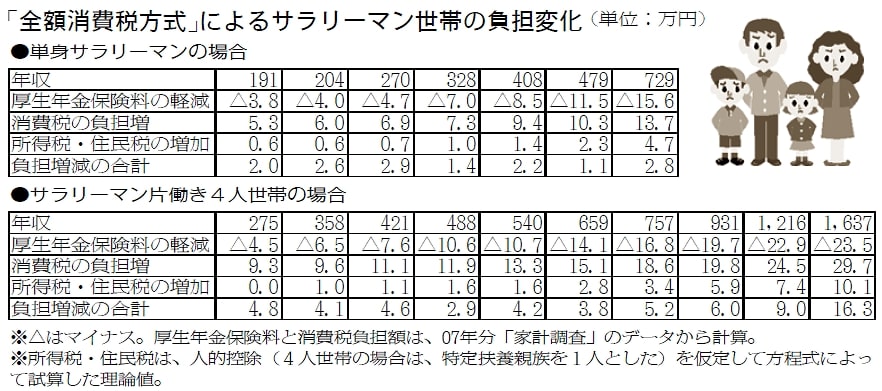 表は、以上の三つの要素を入れて、「全額税方式」を導入した場合のサラリーマンの負担を計算したものです。上の表は単身サラリーマン、下の表は片働き四人世帯の場合です。どちらの場合も、差し引きで負担が重くなるのが分かります。