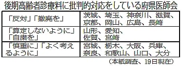 後期高齢者診療料の算定については二十府県医師会が「慎重に」「反対」「撤廃を」など批判的な態度を表明しました。(表)
