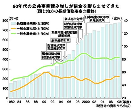 この「計画」が“縛り”となり、自民党政権は、宮沢内閣の「緊急経済対策」を皮きりに、二〇〇〇年まで相次いで、大型公共事業中心の「経済対策」を実施してきました。これが国と地方の借金を急膨張させてきたのです。