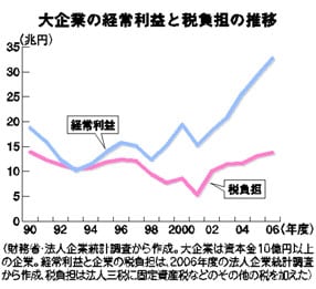 法人企業統計調査(財務省)によると、大企業(資本金十億円以上)の税負担は、九〇年代と比べても横ばい。同じ期間に、経常利益が急激に増加してきたのとは対照的です。