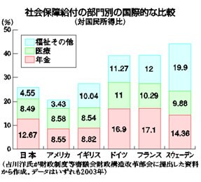 政府の社会保障国民会議に吉川洋座長(東京大学教授)が提出した資料でも、日本の社会保障給付がヨーロッパ諸国と比べて依然、低水準なことが分かります。