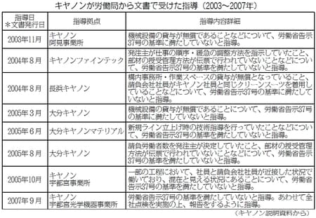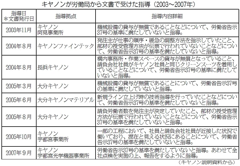 この点では、キヤノンから、偽装請負にかかわって、長浜工場も含め労働局から八件の行政指導を受けたことが、資料とともに明らかにされました(表)。この事実が、キヤノン側から公式に公表されたのは今回が初めてです。