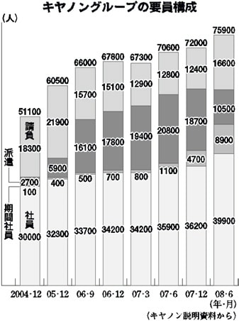 キヤノンから提出された資料(グラフ)によると、〇七年三月末では国内キヤノングループ全体で、正社員などの直接雇用が52%で、半分は派遣や請負という不安定雇用でした。長浜工場では39%で、六割以上が派遣や請負で成り立っていました。私は国会で「派遣工場ではないか」とただしましたが、その実態が間違いない事実だったことも確認できました。