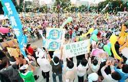 ![]() (写真)風船を飛ばし集会成功を喜びあう会場をうめた4600人の参加者=5日、東京・明治公園 |