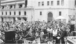 ニューヨーク証券取引所前にネーダー氏の支持者ら約五百人が結集。「ウォール街の犯罪に懲役を」などの横断幕を掲げました。ネーダー氏は「ニューヨーク証券取引所はカジノ資本主義の代表だ」と述べ、米金融界は、多くの庶民が将来のためにと蓄えた資金を「世界最大のカジノにつぎ込んできた」と批判しました。また、米議会が通した七千億ドル(約70兆円)にのぼる不良債権買取法は「投機企業のためのものだ」と指摘。「国民生活にこそ公的資金が必要だ」と訴えました。
