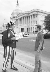 ![]() (写真)米上院での採決の1日、議会前で観光客に金融安定化法案の問題点を語る反対派活動家=ワシントン(西村央撮影) |
