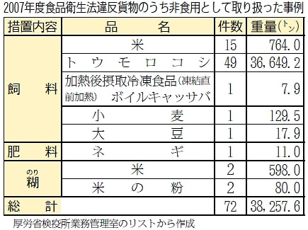 リストによると、同法違反の農作物が「家畜飼料用」に変更されたのは、トウモロコシ三万六千六百五十トン、米七百六十四トン、小麦百三十トン、大豆十八トンなど。「肥料用」が中国産ネギ十一トン。糊(のり)用途となったのが、米粉が八十トン、米五百九十八トン。(表参照)