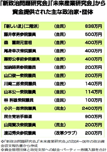 「西松建設の関連政治団体から資金提供を受けていたのは、小沢代表だけではない」。小池氏は〇四年から〇六年の三年間で西松建設の二つの政治団体から資金提供を受けた主な政治家・団体の一覧リストを掲げました。(図)