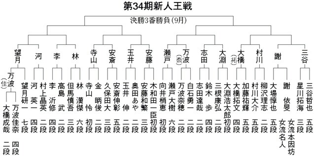 囲碁第三十四期新人王戦(しんぶん赤旗主催)は、本戦一回戦が進行し、四月から二回戦に入ります。九月の決勝三番勝負に向け熱戦が展開されます。(トーナメント表)