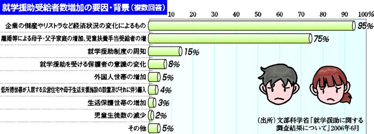就学援助が急増する背景には、親の経済状況の悪化があります。文部科学省が、全国の教育委員会に行ったアンケート調査(〇六年)では、「企業の倒産やリストラなど経済状況の変化によるもの」が95%(複数回答)でトップに挙げられました。就学援助は、子どもたちの学ぶ権利を支える命綱であることは明らかです。
