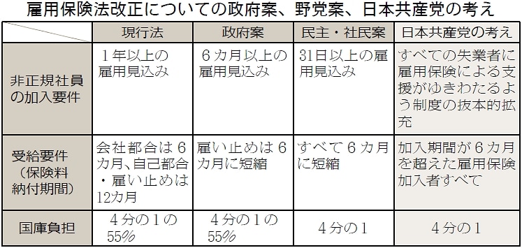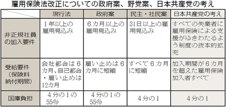 また、失業給付の受給要件については、政府案は雇い止めの場合のみ六カ月に短縮(自己都合は一年)。民主・社民案は、すべての失業者を六カ月に短縮するとしています。