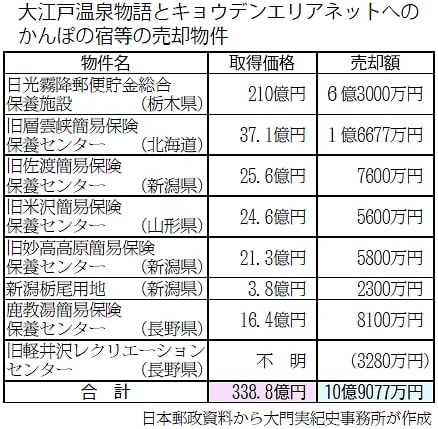 大門氏がとりあげたのは、日本郵政が「大江戸温泉物語(株)」と関連不動産会社「(株)キョウデンエリアネット」に売却した八件のケース。合計約三百四十億円で建設した八件の物件が三十分の一以下の約十一億円で売却されました。このうち二百十億円かけて建設された栃木県日光の施設は、六億三千万円で売却され、いまは「大江戸温泉物語・日光霧降(きりふり)」としてリニューアル。同社がばく大な利益を上げています。しかも、ほとんどが「大江戸温泉物語」などとの随意契約であり、売却額も入札契約も疑惑が指摘されています。