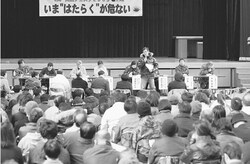 「はたらくをどうする」と題したシンポジウムでは、全労連、連合、全労協の労働組合全国組織と女性、障害者、失業者支援などの市民団体がそろって討論し、労働運動と市民運動の連帯で派遣切りをやめさせ、貧困をなくそうと訴えました。